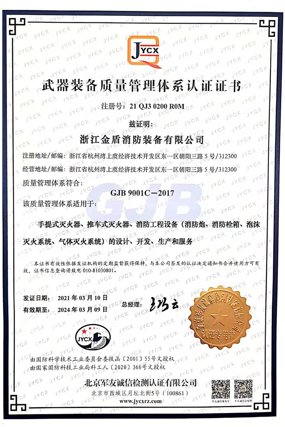 武器裝備質(zhì)量管理體系認(rèn)證證書